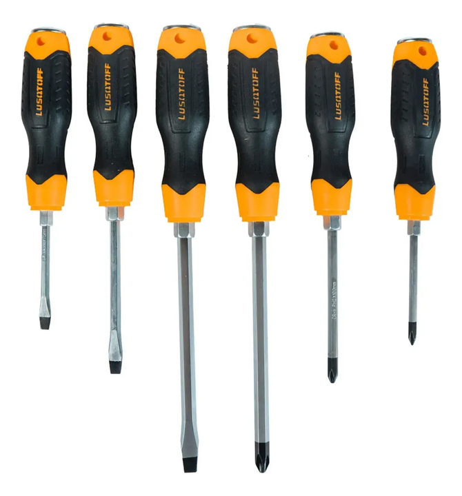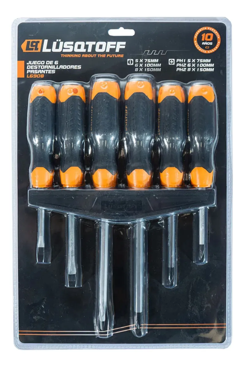 JUEGO DE 6 DESTORNILLADORES PASANTES LUSQTOFF L6908 IMANTADO • Mango ergonómico antideslizante • Punta imantada • Cuerpo hexagonal • Varilla de cromo vanadio • Destornillador plano: 1x plano 6x125 mm • Destornillador philips: 1x philips PH2 6x125 mm Garantía 6 meses