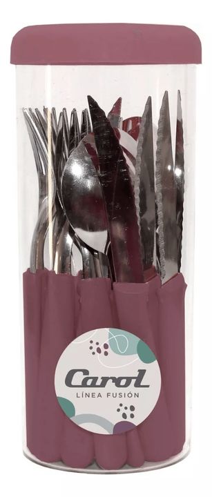Incluye6 tenedores de acero inoxidable con mango plastico6 cucharas de acero inoxidable con mango plastico6 cuchillos filo laser de acero inoxidable con mango plastico6 cucharitas de te de acero inoxidable con mango plasticoFrasco de plastico