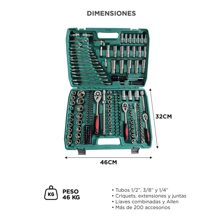 Set completo de 216 piezas para múltiples tareas El Kit de Herramientas Bron By Gadnic reúne tubos, llaves y accesorios para mecánica, mantenimiento y uso general en un solo maletín. Tres encastres para máxima versatilidad Incluye encastres de 1/2”, 3/8” y 1/4”, cubriendo desde trabajos livianos has...