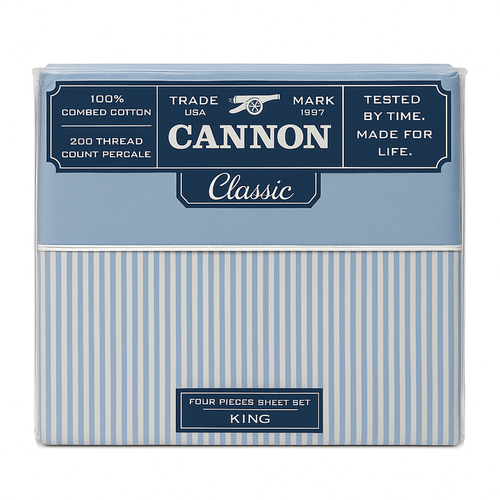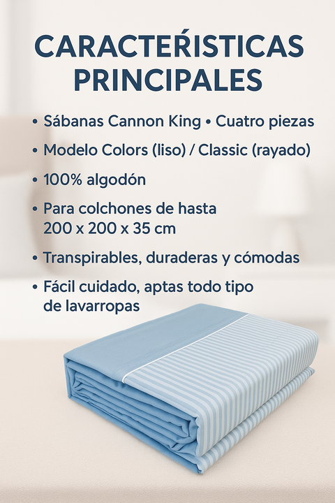 SÁBANAS CANNON CLASSIC 200 HILOS KING (Cuatro Piezas) - Sabanas Cannon King - (Cuatro Piezas) - Modelo Classic Rayado - Composición: 100% algodón - Cantidad de hilos: 200 - Transpirable, duradera y cómoda - Fácil cuidado , apta todo tipo de lavarropas - Resistentes a la decoloración y al frisado - D...