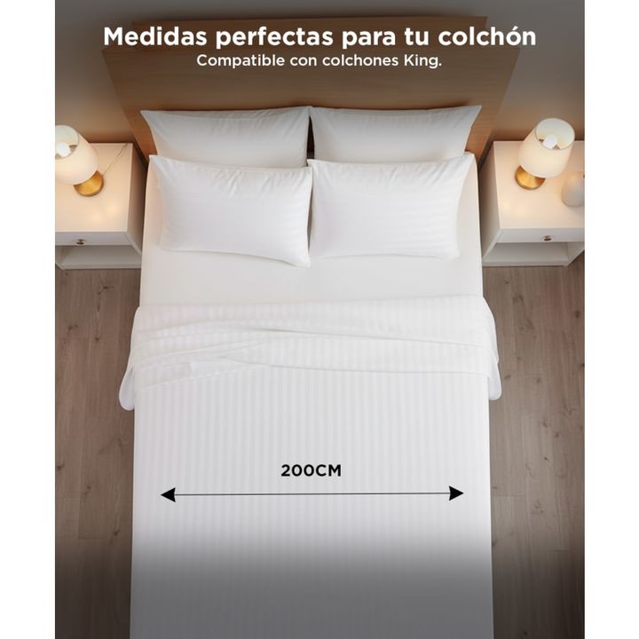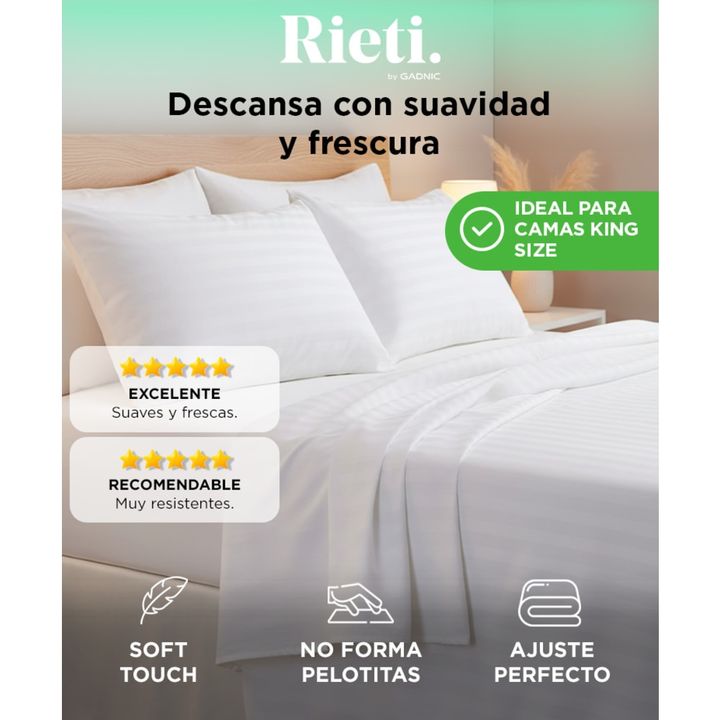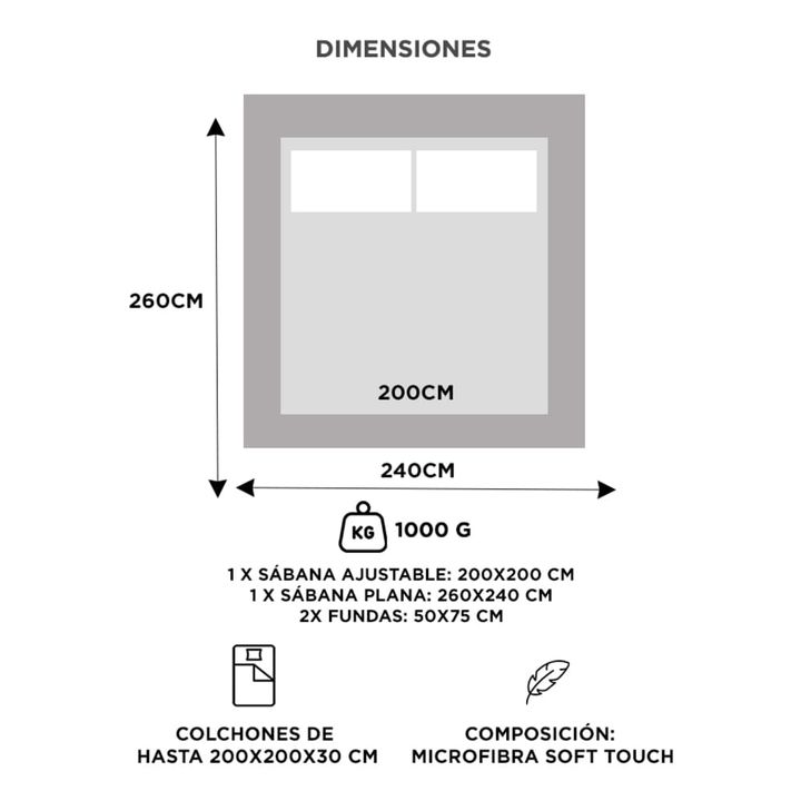 Descubrí el descanso perfecto con el juego de sábanas Rieti by Gadnic. Confeccionadas en microfibra algodonada de poliéster, estas sábanas te envuelven en una suavidad única, brindándote el máximo confort noche tras noche. Tamaño King Size: ideal para colchones de hasta 200x200x30 cm. Sábana ajustab...