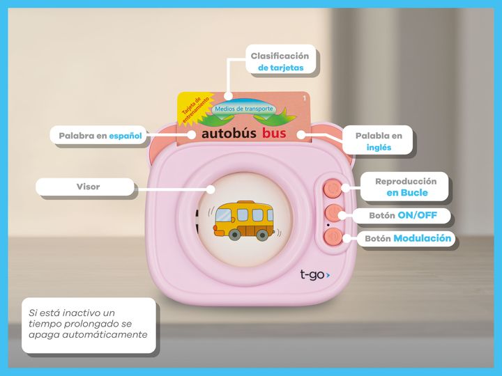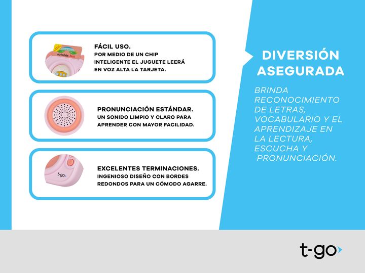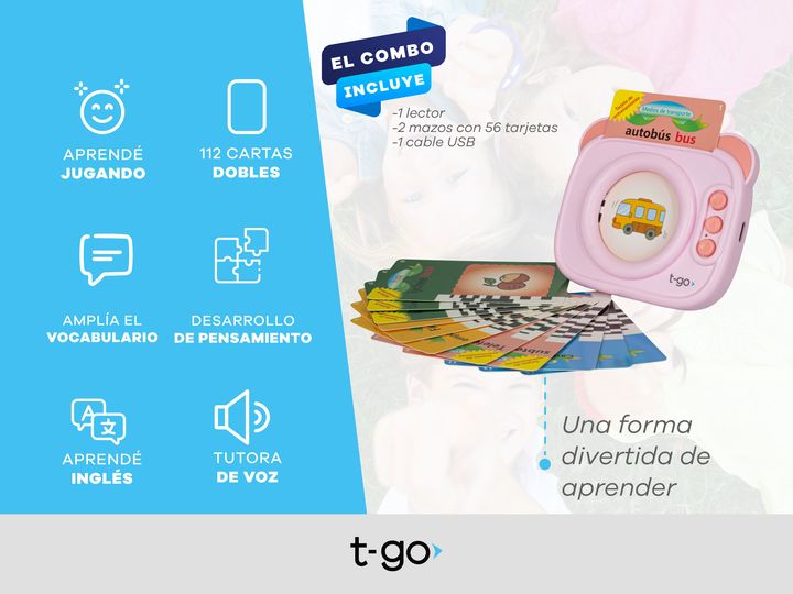 JUEGO ELECTRONICO PARA APRENDER INGLES JUGANDO Estudiar inglés es mucho más divertido con tu lector de tarjetas de T-GO. Los niños pueden mejorar su pronunciación, su escucha y ampliar su vocabulario con este innovador juguete. Al ser liviano, pueden llevarlo a todo lado y aprender mientras se entre...