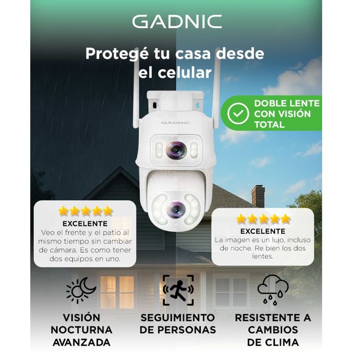 Vigilancia en ultra alta definición La cámara Gadnic Doble Lente 4K ofrece imágenes nítidas con dos sensores de 8 MP reales. Captura cada detalle en calidad 4K, ideal para proteger tu hogar o comercio con máxima claridad. Visión nocturna que no se detiene Gracias a su sistema de luces infrarrojas y ...