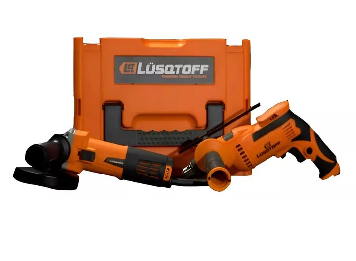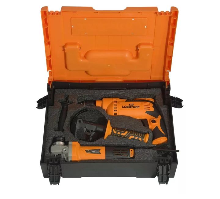 KIT AMOLADORA ANGULAR + TALADRO PERCUTOR KATL-8 DE LUSQTOFF KATL-8 AMOLADORA ANGULAR 115 MM. ESPECIFICACIONES: - Potencia: 720 W - Tensión: 220 V ~ 50 Hz - Velocidad: RO 11000 /min. - Máx. del disco de corte: 115 mm. - Máx. de disco abrasivo: 115 mm. - Rosca: M14 INCLUYE: - 1 mango - 1 llave - 1 gua...