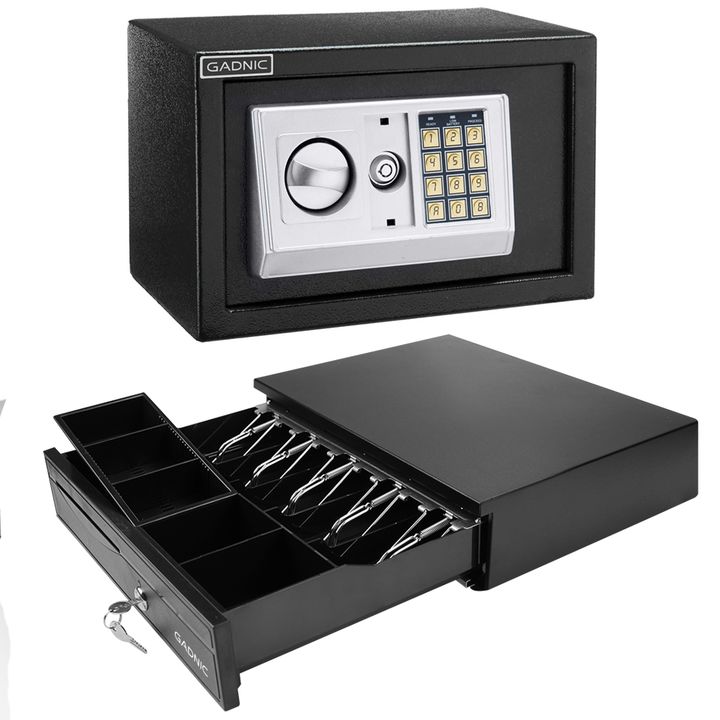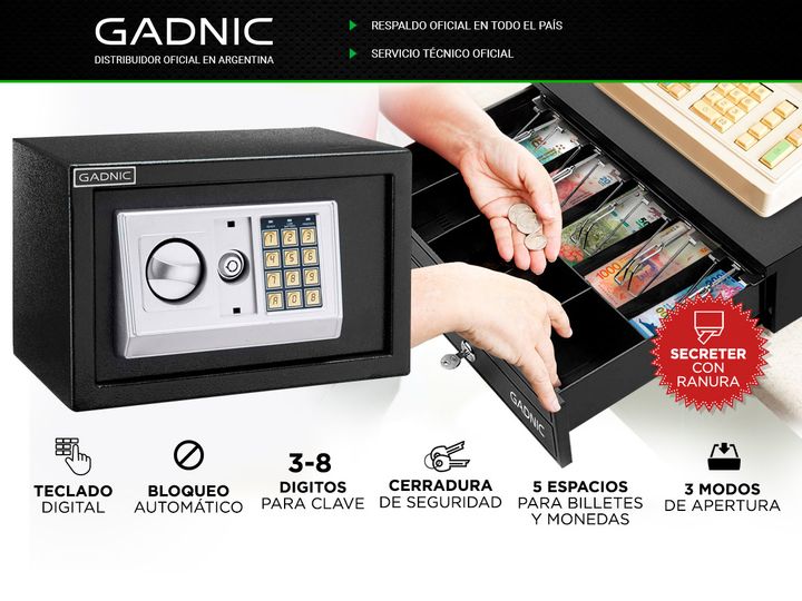 Acerca de KIT Comercial Gaveta Dinero 5 Billetes G405 + Caja Fuerte E20 Mantené tus objetos de valor guardados bajo llave con la caja fuerte de seguridad GADNIC. Esta caja fuerte digital, además de ser compacta, ofrece una capacidad de casi 9 litros que permite acomodar muy bien una amplia gama de a...