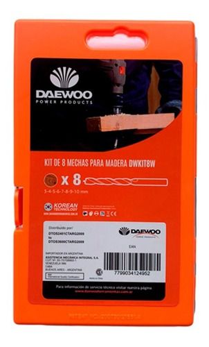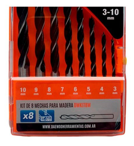 Kit De 8 Mechas Daewoo Para Madera - DWKIT8W El Kit de Mechas para Madera Daewoo DWKIT8W es una solución práctica y versátil para trabajos de carpintería, bricolaje y uso profesional. Incluye 8 mechas de diferentes diámetros, ideales para realizar perforaciones precisas en madera. Fabricadas para of...