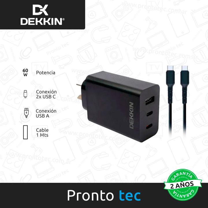 CARACTERÍSTICAS: - Marca: Dekkin - Modelo: KI-073 - Material del cable: PVC - Entrada del cargador: 1x USB A, 2x USB C - Potencia: 65 W - Carga rápida: Si - Largo cable: 1 Mt - Carga simultánea: Si - Tecnología PPS: Si CONTENIDO DE LA CAJA: - Manual de Usuario