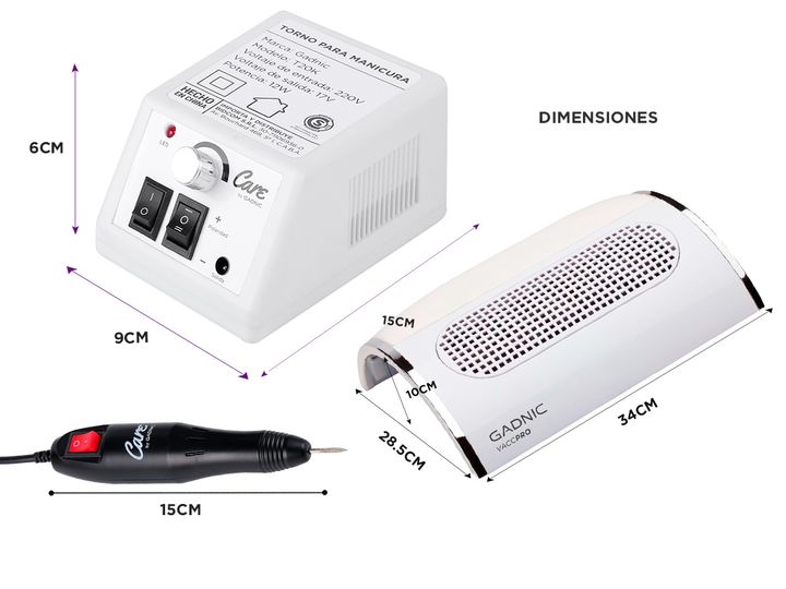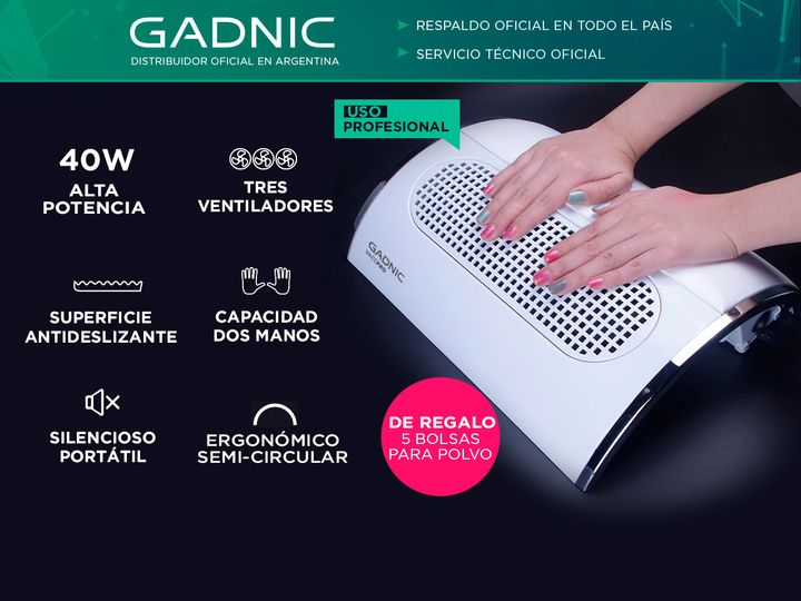 Especificaciones Extractor de Polvo para Uñas Gadnic VaccPro 40w Ergonómico Uso Profesional Alta potencia Uso profesional Súper silencioso 3 Ventiladores Capacidad 2 manos Ergonómico: Semi-Circular Base Anti-deslizante Superficie Acolchonada Alimentación: 220 [V] Potencia nominal: 40 [W] Dimensiones...