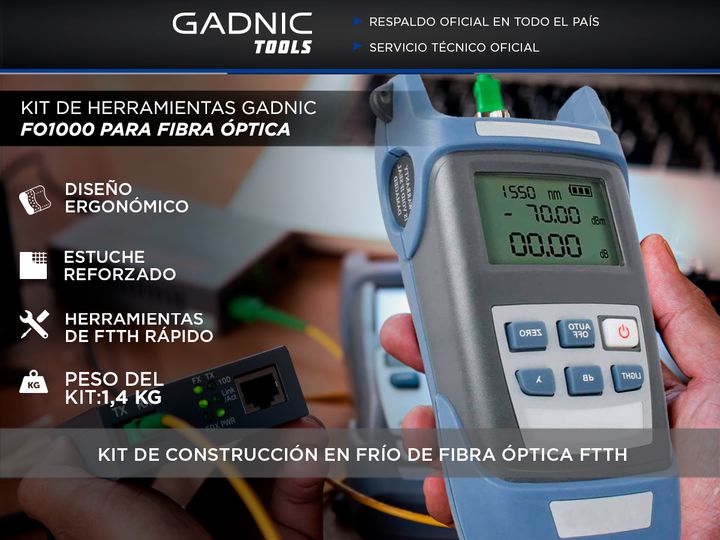 ¡Gadnic presenta su nuevo KIT para instalación de fibra óptica ! [Kit de herramientas de FTTH rápido] El kit de construcción en frío de fibra óptica FTTH es una conexión rápida Fttx FTTH en la construcción del proceso de prueba y limpieza de corte de fibra de pelado de cables con aislamiento de goma...