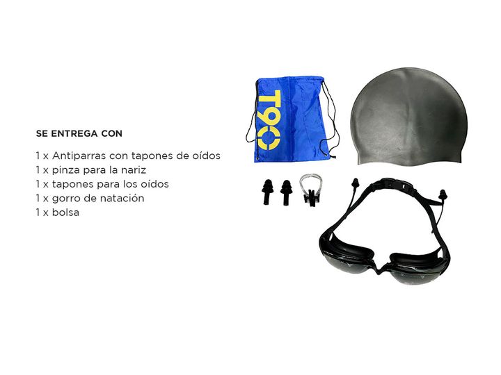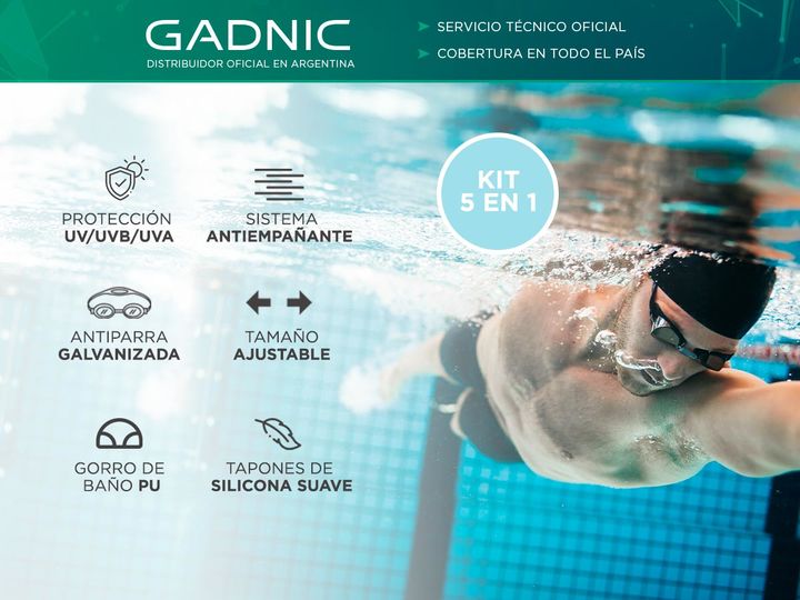 ¡Gadnic les presenta el Kit de Natación 5 en 1! Este kit les permitirá disfrutar al máximo de sus sesiones de natación. Las antiparras de natación vienen con un par de tapones para los oídos y además, un par de tapones para los oídos separados. Este kit también incluye un gorro de baño impermeable d...