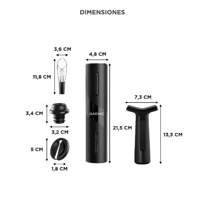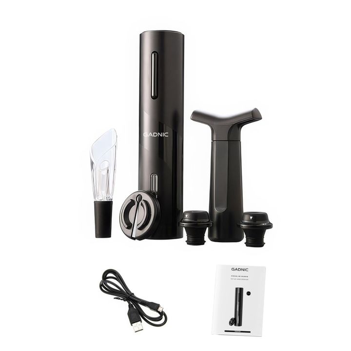 ¡Nuevo kit de vino Gadnic! Este kit incluye 4 elementos esenciales para disfrutar de un buen vino: Sacacorchos Eléctrico, Decantador, Bomba de vacío y cortador. Es ideal para sommeliers y fanáticos del vino. Mejora tu experiencia Con el sacacorcho a batería abrir un vino es una tarea mucho más senci...