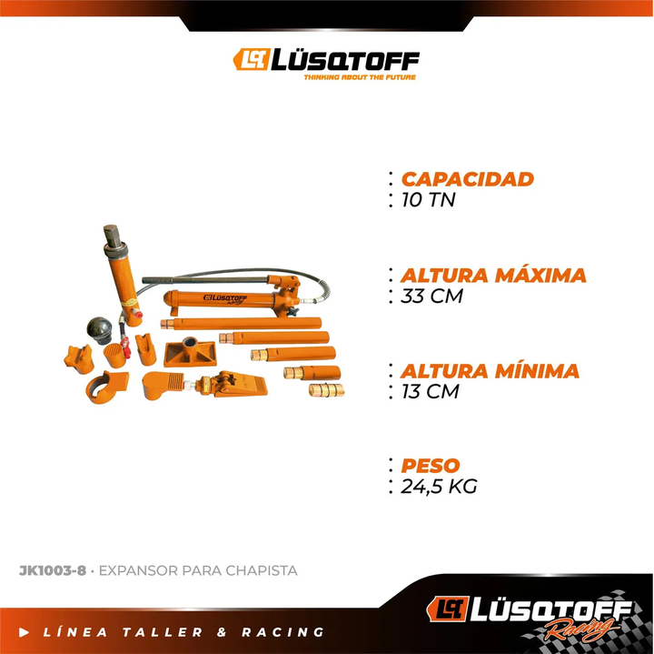 KIT DE EXPANSOR PARA CHAPISTA LÜSQTOFF JK1003-8 HIDRÁULICO DE 10 TONELADAS JK1003-8 • Capacidad: 10 TN • Altura mínima de cilindro: 130 mm • Altura máxima de elevación: 330 mm • Portable • Peso: 24,5 kg • Incluye estuche organizador Garantía 12 meses