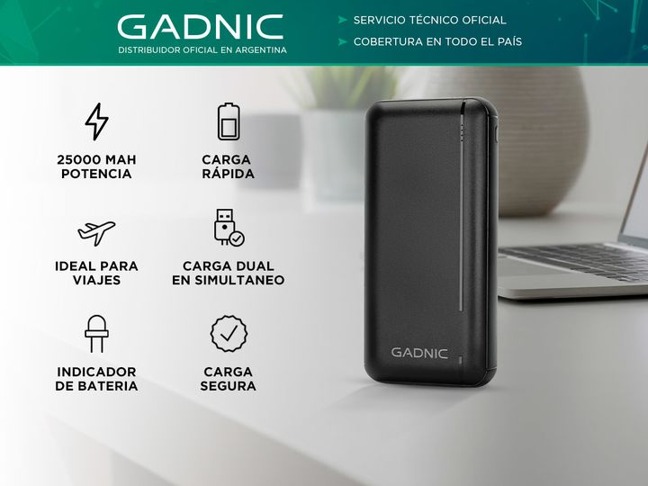 ¡GADNIC presenta su última generación de Cargadores portátiles! Este power bank ofrece una alta capacidad de carga de 25.000mAh a través de dos puertos usb. Cargue su smartphone y tablet de forma simultánea y rápida. Posee una enorme capacidad de carga de 25.000mAh, además ¡y ademas, tiene carga RÁP...