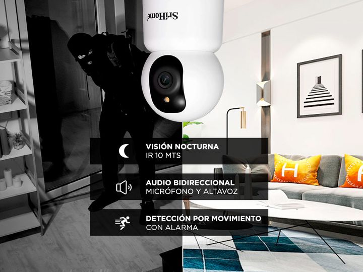 Especificaciones Cámara de Seguridad IP SriHome 4MP Wifi 5g 2.4g - P2PSRI03 FHD: 5MP, 1920P (2560 * 1920), inteligente H.265 Audio: Micrófono y altavoz integrados, compatible con audio bidireccional PTZ: panorámica: 355, inclinación: 70, zoom digital 3x Lente: lente de 4 mm, rango IR de hasta 10 m V...