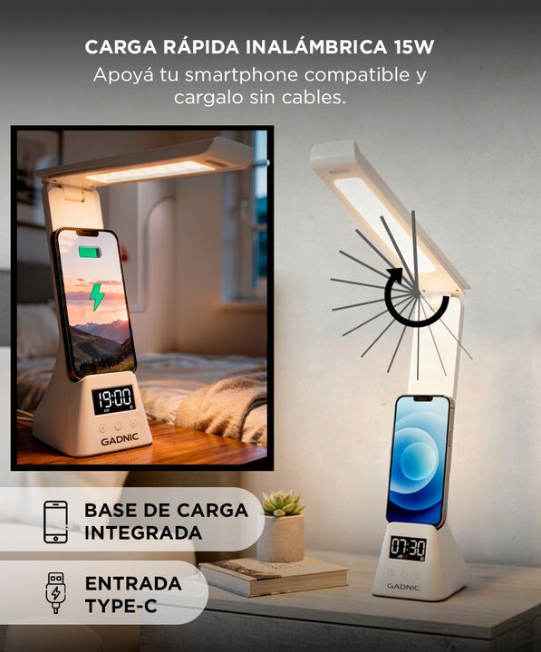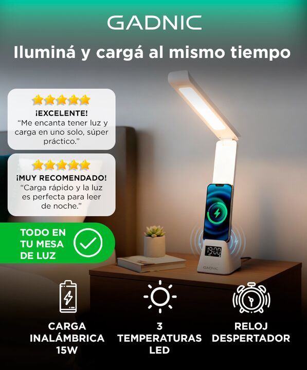 Carga inalámbrica rápida integrada de 15W: El Velador GADNIC DESKL014 permite cargar tu smartphone compatible simplemente apoyándolo en la base. Elimina cables en la mesa de luz y mantiene tu espacio ordenado. Iluminación LED con 3 temperaturas ajustables: Ofrece luz blanco frío, natural y cálido pa...