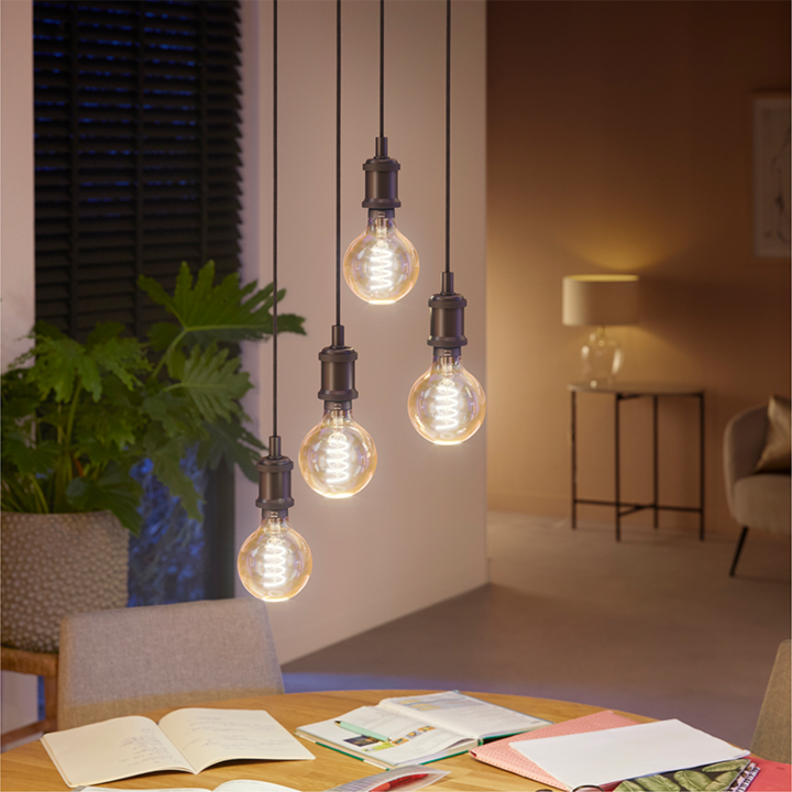 Philips Hue - Lámpara Led Inteligente Filamento, Luz Blanca de cálida a fría, casquillo E27 G93, 7W 550 Lúmens x 3 unidades + Bridge . Compatible con Alexa, Google Home y Apple Home Kit. Características: • Instala fácil y rápidamente tu sistema de iluminación inteligente. Conectala y enlazala vía Bl...