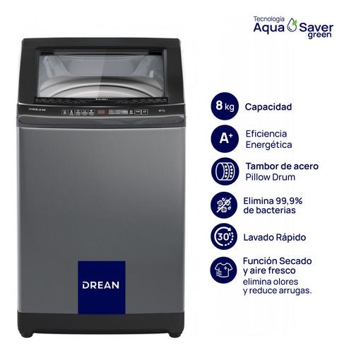 Lavarropas automático de carga superior. Su capacidad de lavado es de 8 Kg. Su velocidad de centrifugado es regulable hasta 660 RPM. Color gris. Eficiencia energética A+. Sistema de lavado oriental. 9 programas de lavado: ECO, Remojo, Lavado a mano, Algodón EEE, Acolchado, Delicado, Express, Satiniz...