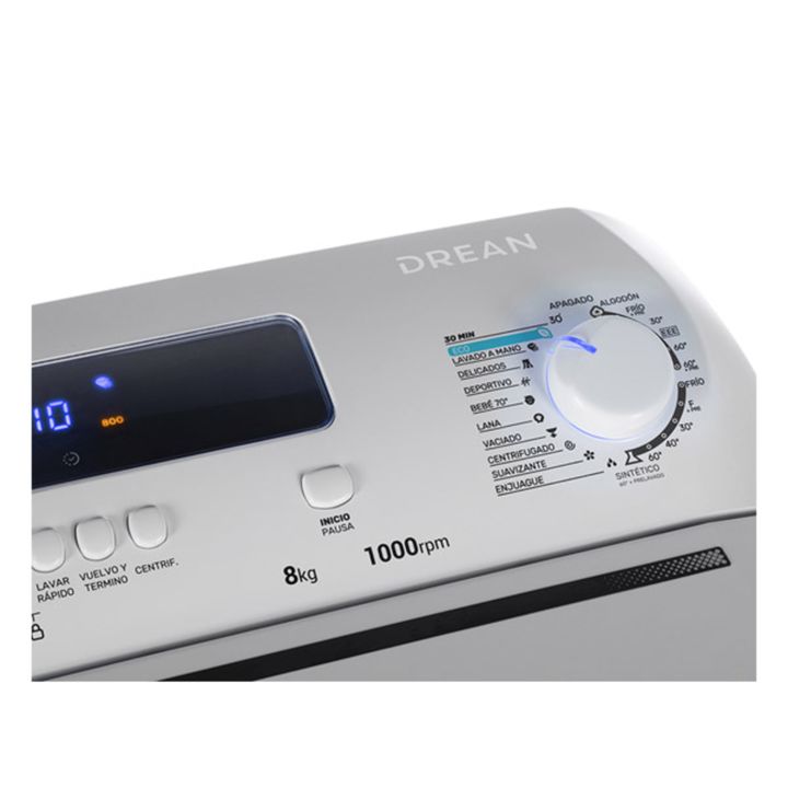 Lavarropas automático de carga superior. Capacidad de 8 Kg. Color blanco. Velocidad regulable hasta 1000 RPM. Eficiencia energética A++. Sistema de lavado europeo. Display LED y perilla bidireccional. Bloqueo para niños. Sistema autobalance. Carga auto adaptativa. Lavado rápido 30’. Origen Argentina...