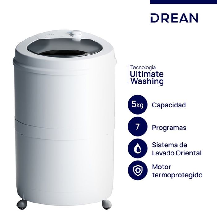 LAVARROPAS SEMIAUTOMATICO LRDR57SB0 5KGCS BL DREAN -Capacidad 5 kg -Color Blanco -Cantidad de programas 7 -Velocidad de centrifugado Sin centrifugado -Estilo Carga superior -Tipo de control Perilla -Tipo de Lavado Oriental -Tambor Plástico -Tipo Semiautomática -Desagote Manual -Jabonera 2 compartime...