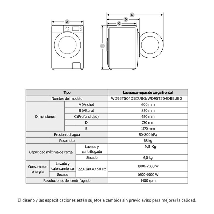 Lavado 9.5 Kg | Secado 6 Kg | 1400 RPM | LAVADO IMPULSADO POR IA | SMARTHINGS | WIFI | ECOBUBBLE | AIRWASH | DIGITAL INVERTER | Lavado Rápido de 15 BURBUJAS PODEROSAS Disfrutá de una limpieza eficiente, incluso a bajas temperaturas con la tecnología Eco Bubble. El detergente se convierte en burbujas...