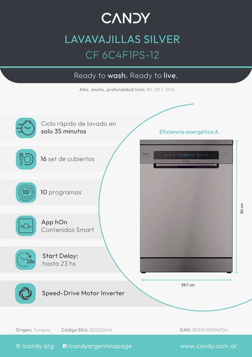 Lavavajillas Candy Inverter RapidÓ 16 cubiertos acero inox. - CF6C4F1PS Tecnología Inverter Motor de alta tecnología desarrollado por Candy , que mejora la velocidad y eficacia del lavado hasta un 50% más en comparación a los motores tradicionales. hOn Wifi, Bluetooth, control remoto y contenidos ex...