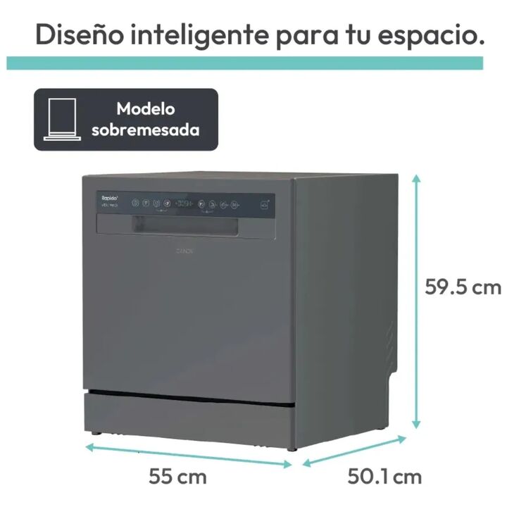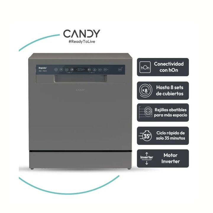 Lavavajillas Sobre Mesada Candy Cp8f9ffa-12 8 Cubiertos Gris CP8F9FFA-12 PRINCIPALES CARACTERISITICAS Nombre del producto / Código del producto CP8F9FFA-12 Tipo de Carga Frontal Instalación Sobre Mesada Capacidad de cubiertos 8 Lineal RapidO CARACTERISTICAS TECNICAS Conectividad WiFi + Bluetooth, Co...
