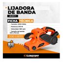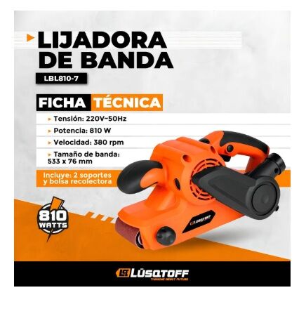 Tensión: 220 V ~ 50 Hz • Potencia: 810 W • Velocidad: 380 Rpm. • Tamaño de banda: 533 x 76 mm. • Centrador de banda que permite ajustar la banda de lija INCLUYE - 2 soportes de fijación - Bolsa recolectora - 1 lija de repuesto - Garantía: 12 meses