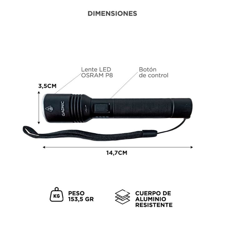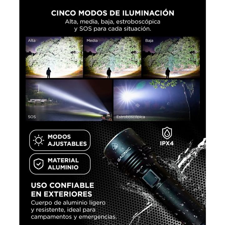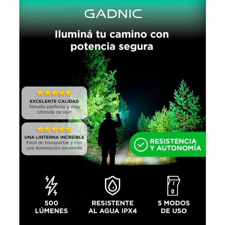 Potencia de 500 lúmenes: Iluminá caminos, espacios abiertos o interiores con claridad en cada uso. Cinco modos de luz: Elegí entre alta, media, baja, estroboscópica o SOS según la situación. Diseño compacto y liviano: Con solo 153 g y 14 cm, resulta práctica para llevar en la mochila o bolsillo. Res...
