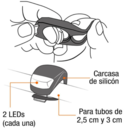 Duración de carga de la batería: 55 horas Modos de iluminación: (3) Fija, destello intermitente rápido y lento Pilas: 2 CR2032 3 V (incluidas) Grado: IP44 Material del cuerpo: Silicón flexible