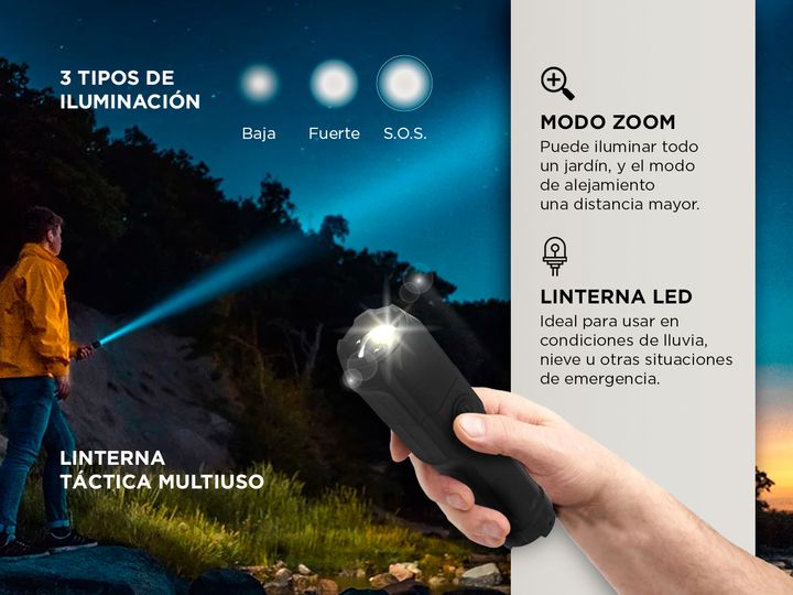 Esta linterna LED ofrece versatilidad con sus tres modos de iluminación: alto, bajo y SOS, permitiendo ajustar la luz según tus necesidades. Su función de zoom te permite iluminar completamente un jardín, o enfocar a larga distancia en modo de alejamiento. Con una potencia de alto lúmenes, esta lint...