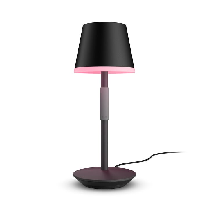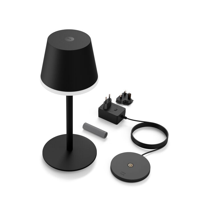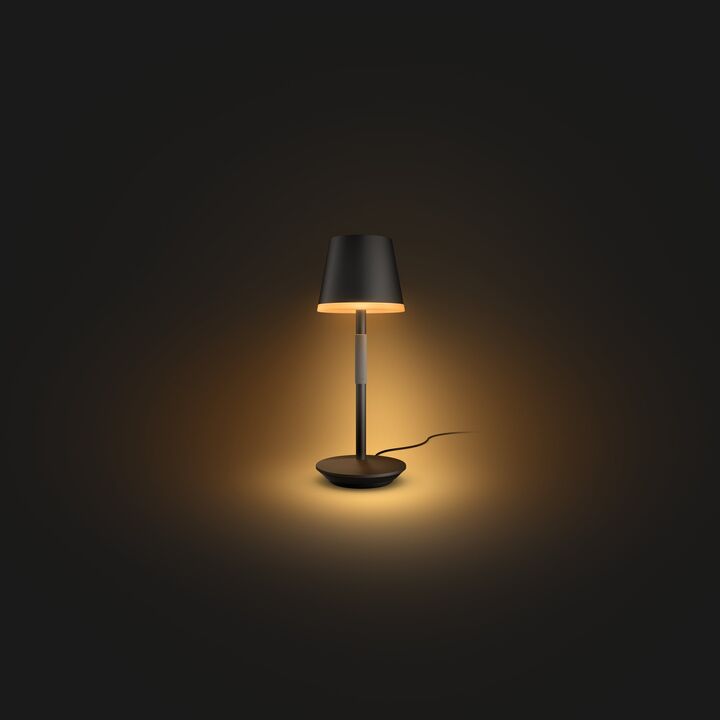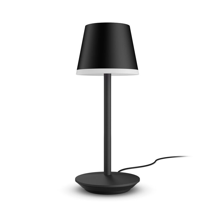 Lleva la luz inteligente a donde quieras con esta lámpara inteligente portátil en color negro. Ideal para uso en exteriores y con una empuñadura de silicona gris oscuro, es fácil de llevar donde más hace falta la luz, al interior para leer o afuera para cenar.