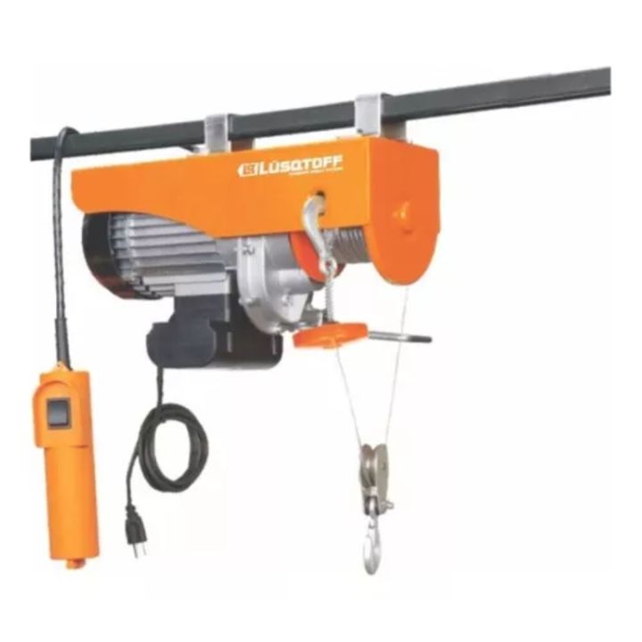 Aparejo eléctrico N2 LUSQTOFF 250 / 500Kg N2 • Tensión 220 V ~ 50 Hz • Potencia: 1000 W • Capacidad de carga: 250-500 Kgs. • Elevación máxima: 12 mts • Contiene: aparejo, roldana, 1 gancho • Diámetro cable: 4 mm • Material del Cable: linga resistente de acero • Peso: 15 Kg • Tamaño pequeño y fácil d...