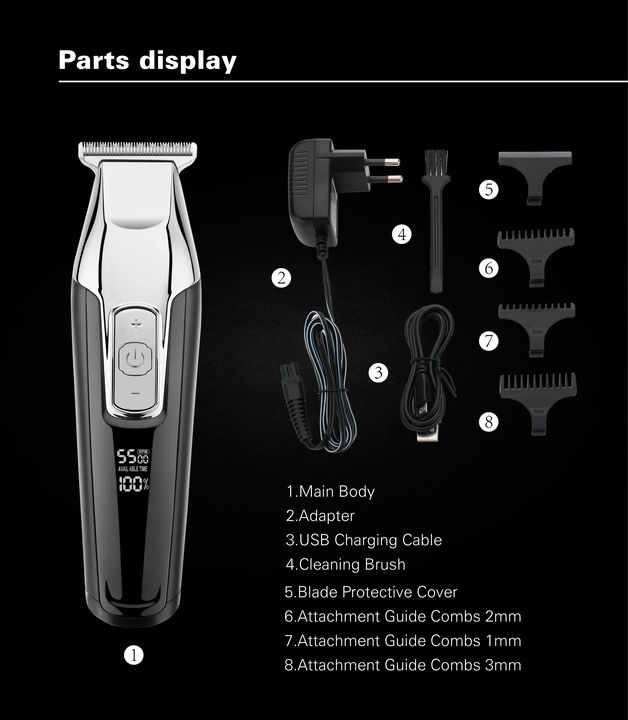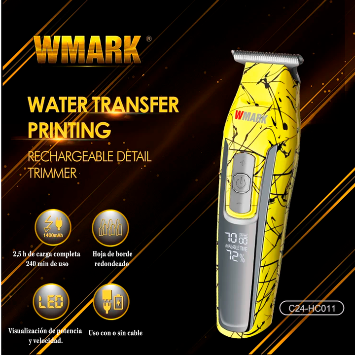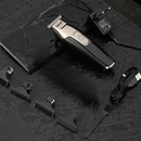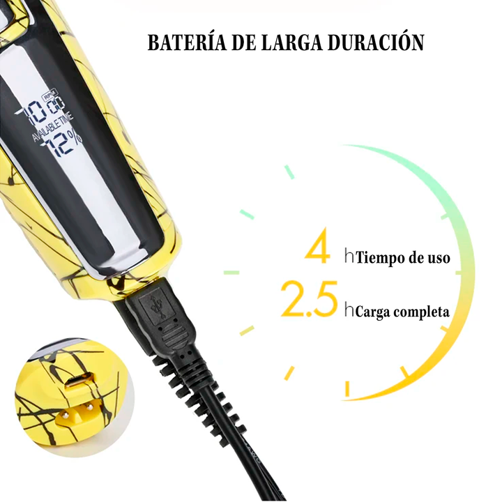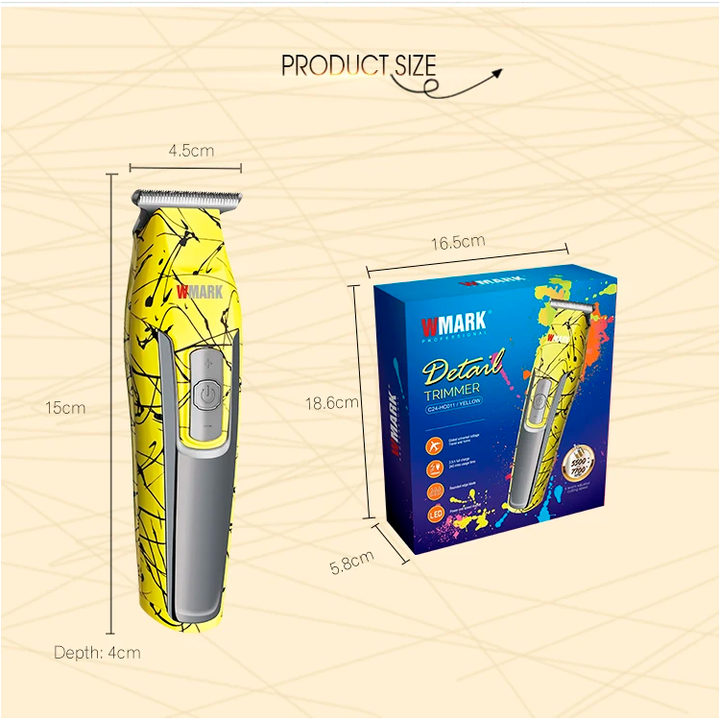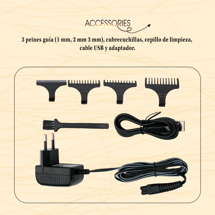 RECHARGEABLE DETAIL TRIMMER 100-240V, USB CHARGE CABLE SKU Yellow: C24-HC011Y SKU Silver: C24-HC011 • Cuchillas anchas de acero inoxidable estilo T de aproximadamente 0,1mm de espacio. • Batería de litio: 1400mAh. • 2,5 horas de carga completa para 180 minutos de uso. • 4 Ajustes de velocidad: 5500/...