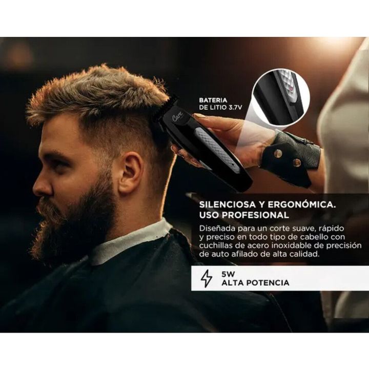 Diseñada para un corte suave, rápido y preciso en todo tipo de cabello con cuchillas de acero inoxidable de precisión de auto afilado de alta calidad. Su aleación con carbono la diferencian de las de la competencia haciéndolas mas duraderas. Gracias a su batería de Ion de Litio, la duración y potenc...
