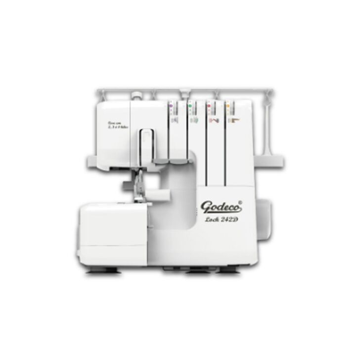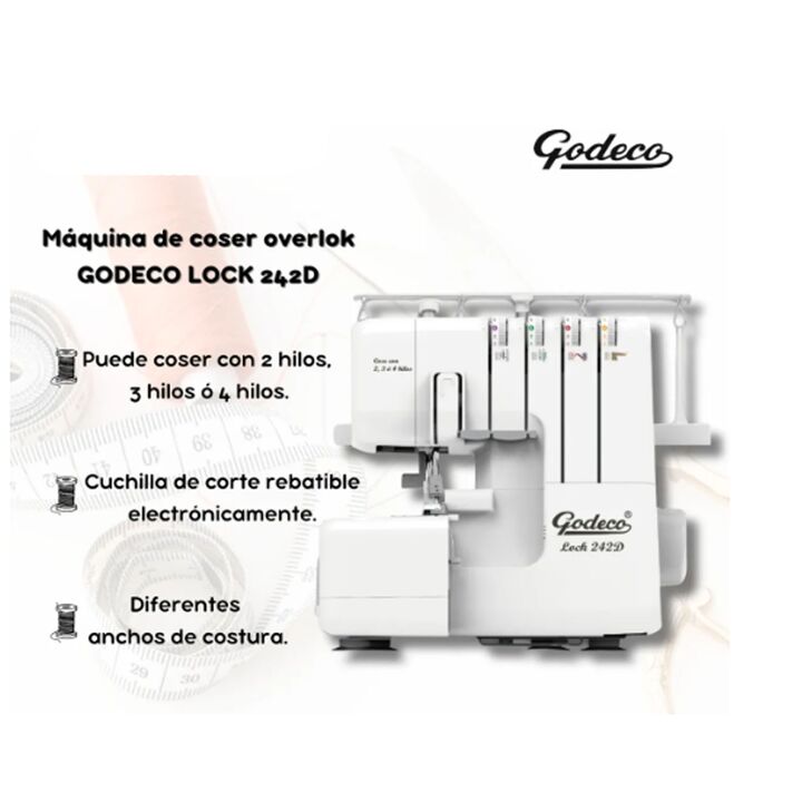 Máquina para coser overlock Godeco Lock 242D * Características: • Cuchilla de corte rebatible electrónicamente. • Diferentes anchos de costura. • Diseño “inteligente”. • Mesa de trabajo rebatible. • Alta velocidad de trabajo. • Completo set de accesorios en bandeja deslizante incorporada. • Disposit...