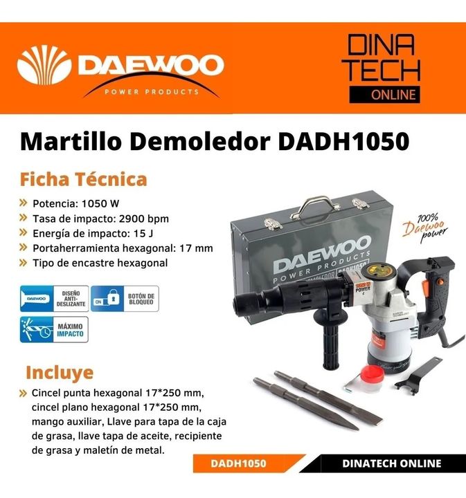 Martillo Demoledor Daewoo DADH1050 17mm + Puntas + Maletin Modelo: DADH1050 Especial para uso pesado para obra, ideal para demoler hormigon - lozas - paredes. Uso profesional y calidad garantizada de la marca. Es un martillo para demoler estructuras cementicias y/o piedras. CARACTERÍSTICAS: - Tipo: ...