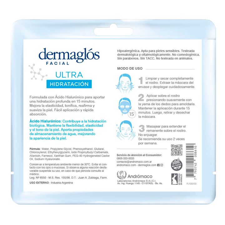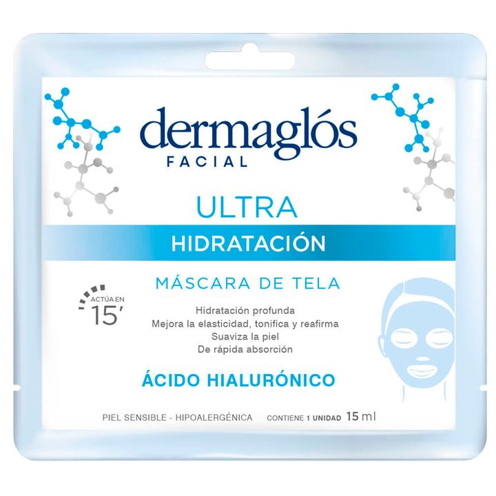 La Máscara de Tela Dermaglos Ultra Hidratación de 15ml es una solución eficaz para una hidratación intensiva en tan solo 15 minutos. Formulada con Ácido Hialurónico, proporciona una hidratación profunda que mejora la elasticidad, tonifica, reafirma y suaviza la piel. Su fácil aplicación y rápida abs...