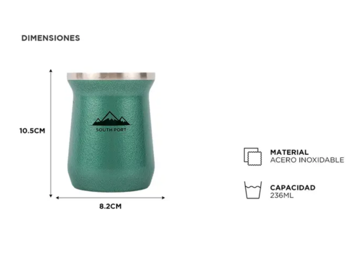 ¡Nuevo Mate Térmico De Acero Inoxidable ! El nuevo Mate Térmico South Port Mantiene la temperatura optima del mate durante toda la cebada. Es Higiénico y Practico. Especificaciones Dimensiones: 8.2 x 10.5 cm Material: Acero Inoxidable Capacidad: 236 ml