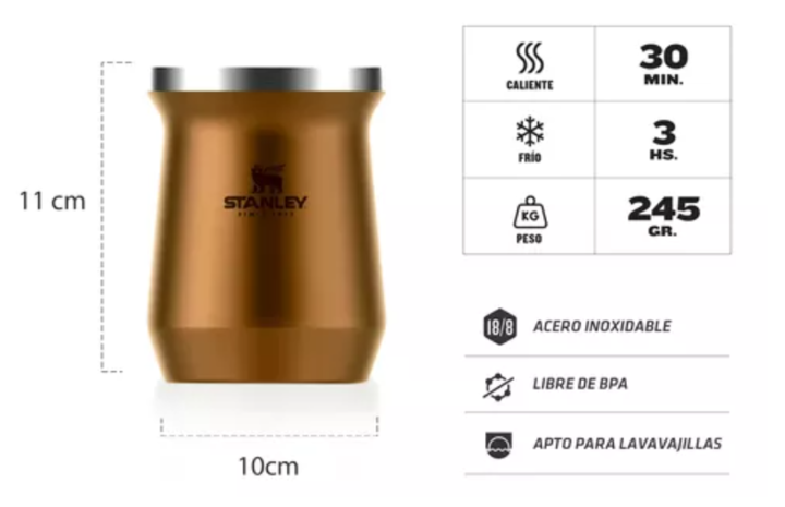 MATE TERMICO STANLEY CLASSIC 236ML ORIGINAL ACERO INOXIDABLE 10-09628-048 El mate Stanley conserva la temperatura durante la sesión de mate. Es práctico y fácil de limpiar. ESPECIFICACIONES; - Conserva la temperatura caliente durante 30 minutos y la fría durante 3 hs - Altura: 10.5 cm - Diámetro: 8 ...