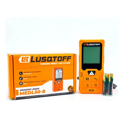 LUSQTOFF MEDIDOR LASER MEDL50-8 CARACTERISTICAS: - Laser luz roja - Distancia de medición: 50 metros - Precisión: +/-2.5 mm - Alimentación: 2 pilas AAA de 1.5 V - Protección al polvo y agua: IP54 - Dimensiones: 110 x 55 x 25 mm - Aplicación de medición: distancia - área volumen altura indirecta pitá...