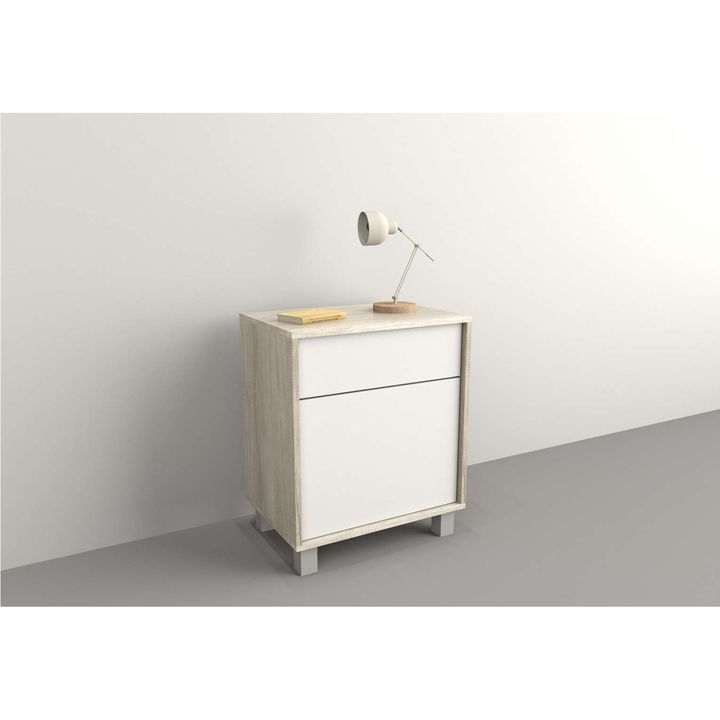 Mesa de luz estilo minimalista. Melamina de 15 mm. Sistema Minifix. Patas plásticas. Un cajón con correderas metálicas. Una puerta con sistema de apertura Push. Un estante interior. Color Nevado y Everest. Medidas: Ancho: 0.52 mts. Alto: 0.63 mts. Profundidad: 0.36 mts. Producto seleccionado para ...