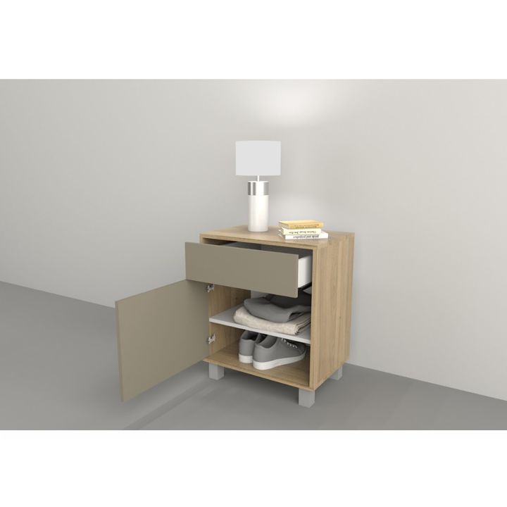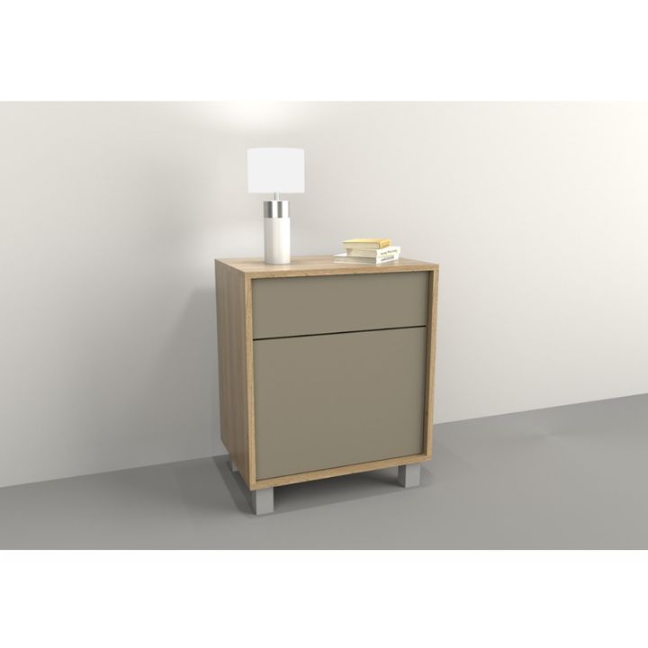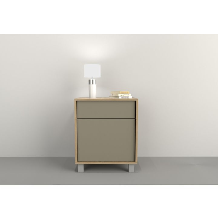 Mesa de luz estilo minimalista. Melamina de 15 mm. Sistema Minifix. Patas plásticas. Un cajón con correderas metálicas. Una puerta con sistema de apertura Push. Un estante interior. Combinado en Olmo Finlandés con Gris. Medidas: Ancho: 0.52 mts. Alto: 0.63 mts. Profundidad: 0.36 mts. Producto sele...