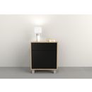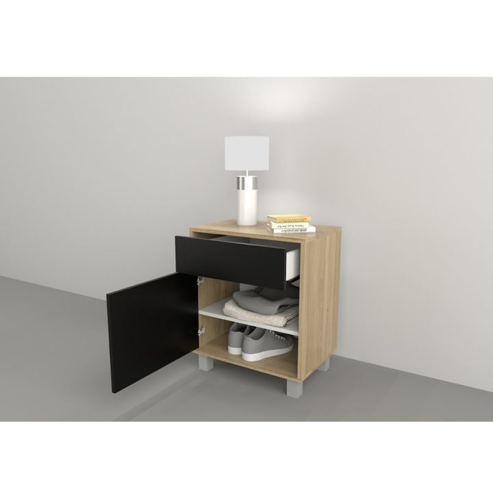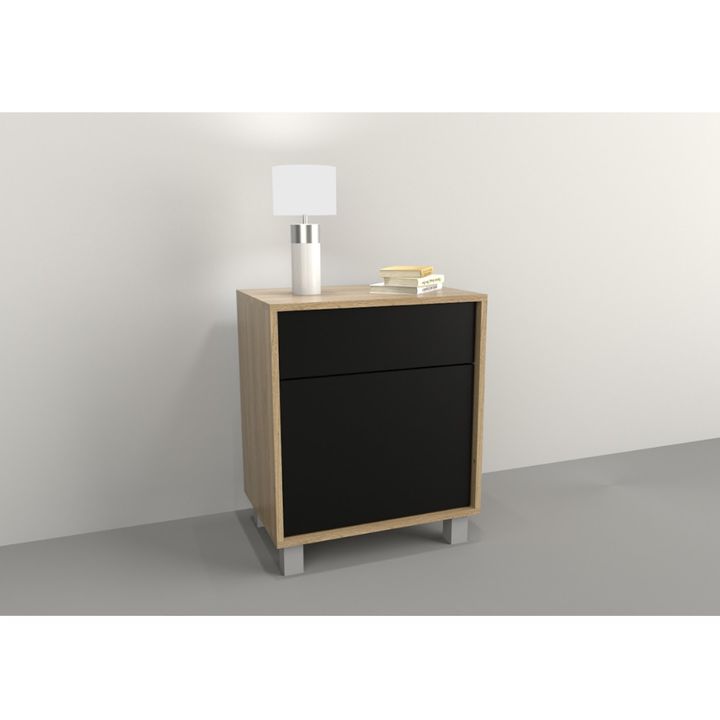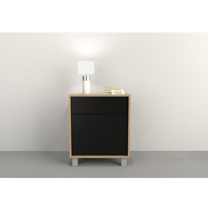Mesa de luz estilo minimalista. Melamina de 15 mm. Sistema Minifix. Patas plásticas. Un cajón con correderas metálicas. Una puerta con sistema de apertura Push. Un estante interior. Combinado en Olmo Finlandés con Negro. Medidas: Ancho: 0.52 mts. Alto: 0.63 mts. Profundidad: 0.36 mts. Producto sel...