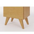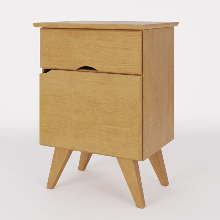 Mesa de luz de Pino Macizo. Estilo Escandinavo. Una puerta y un cajón, con correderas metálicas y tiradores calados. Patas Nórdicas. Medidas: Ancho: 0.53 mts. Alto: 0.61 mts. Profundidad: 0.42 mts.