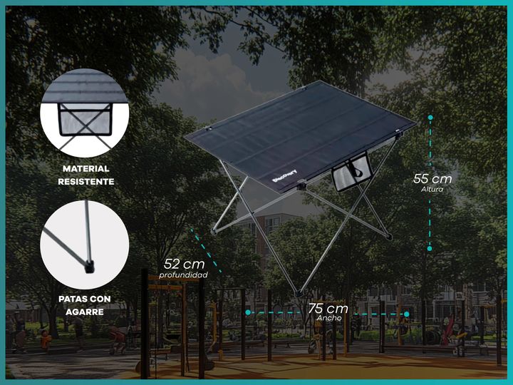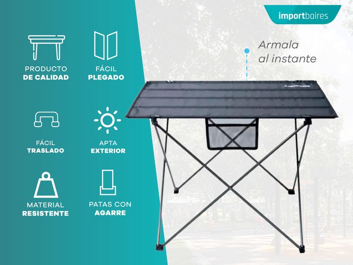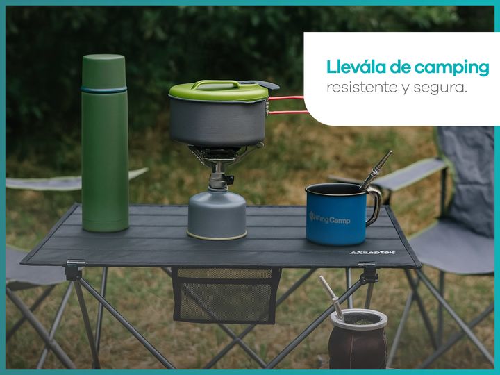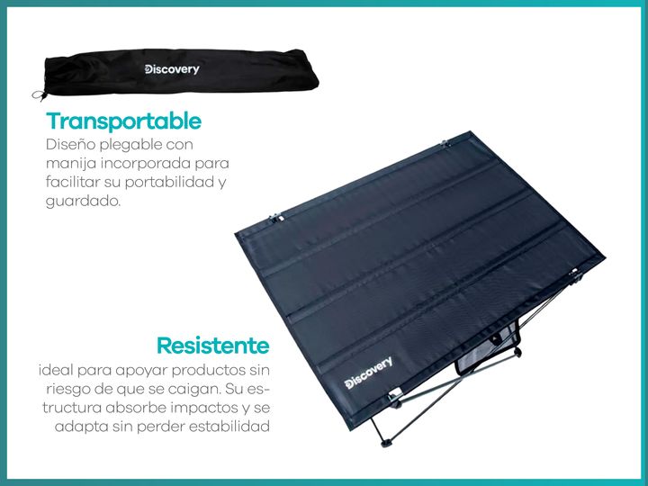 MESA PLEGABLE DISCOVERY -Lista para usar en unos pocos segundos. Ideal para camping, pesca o actividades al aire libre. -Dimensiones guardada: 76 cm de largo x 7 cm de diámetro. -Superficie semirrígida, firme y estable para apoyar lo que necesites. -Estructura de hierro de alta resistencia, pensada ...