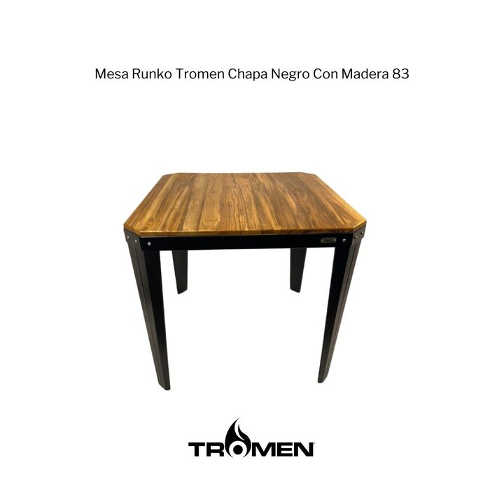 MESA RUNKO TROMEN CHAPA NEGRO CON MADERA 83 Marca:Tromen Código: 06-000-051T Transformá tus espacios. Una solución para cada ambiente funcional y adaptable. Especificaciones Dimensiones ANCHO 83 cm ALTO 77 cm PROFUNDIDAD 83 cm PESO 23 kg Características Madera Teca alistonada con laca pulida y borde...