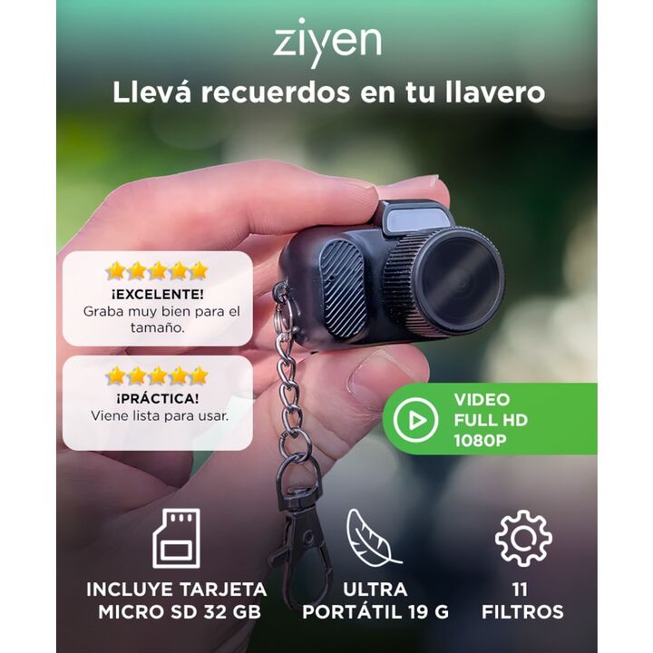 Portabilidad extrema para llevarla siempre con vos: La Mini Cámara Digital Portátil ZIYEN está diseñada para acompañarte a todos lados gracias a su formato ultra compacto y peso de solo 19 gramos. Su diseño con llavero permite transportarla cómodamente sin ocupar espacio, ideal para capturar momento...