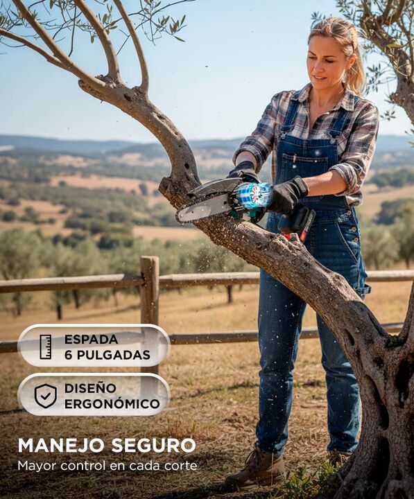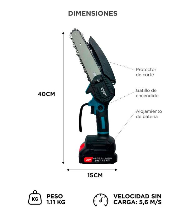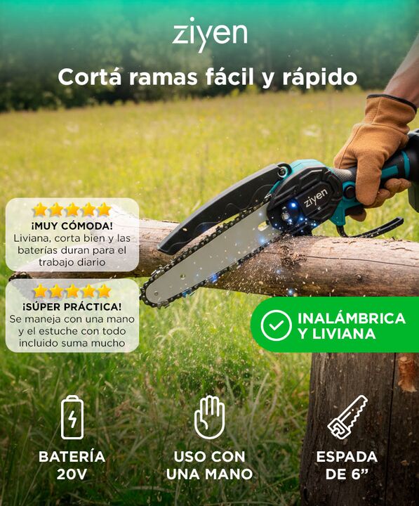 Corte rápido y preciso para podas domésticas: La Mini motosierra Ziyen permite cortar ramas y realizar podas livianas de forma práctica. Su diseño compacto facilita el control en trabajos de jardín. Funcionamiento inalámbrico con batería 20V: Incorpora batería recargable que brinda libertad de movim...