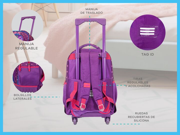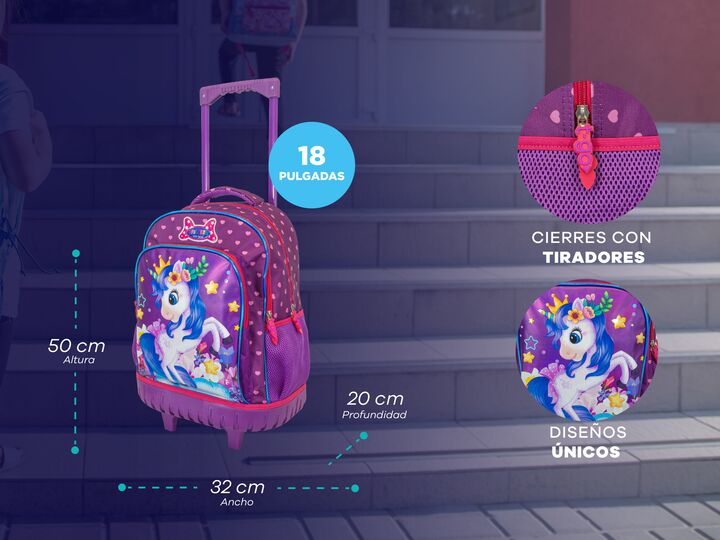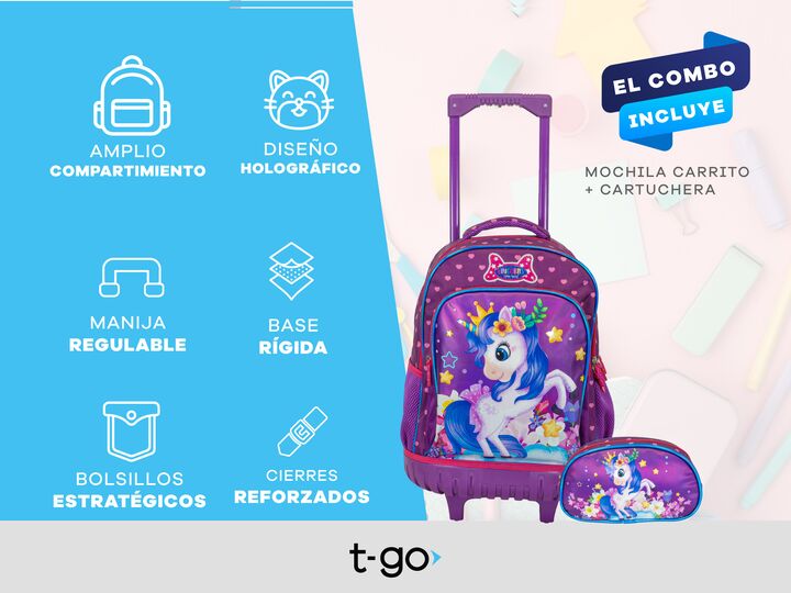KIT ESCOLAR PREMIUM DE MOCHILA CARRITO 18 GRANDE + CARTUCHERA -Mochila carrito de 18 pulgadas con manija extensible. -Material: poliéster premium. -Compartimiento principal superamplio. -2 bolsillos frontales con cierre. -2 bolsillos laterales de red portabotella u otros accesorios. -Tiras de espald...