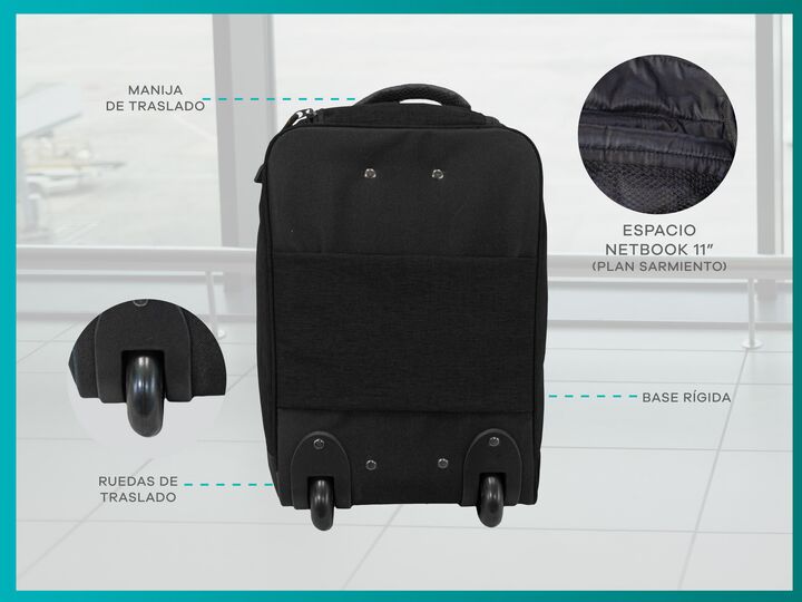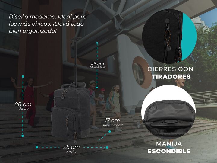 MOCHILA ESCOLAR CARRITO PARA NIVEL INICIAL ESCOLAR -Con rueditas para un cómodo traslado. -Manija telescópica monomando que se esconde -Apertura principal frontal como valija. -Compartimiento para un dispositivo de hasta 14 pulgadas. -Altura máxima con manija extendida: 83 cm. -Dimensiones: 38 cm de...